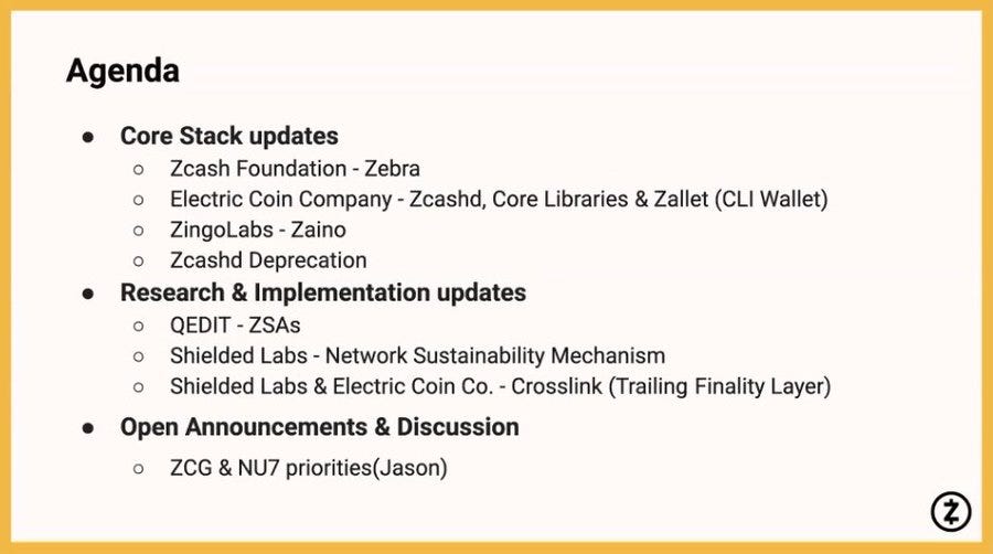 Core Stack Updates from the Zcash Foundation on Zebra, and from ECC on Zcashd.We`llalso get updates from Zingo Labs on Core Libraries like Zallet, Zaino & Zcashd. As well as Ongoing R&I Progress.
