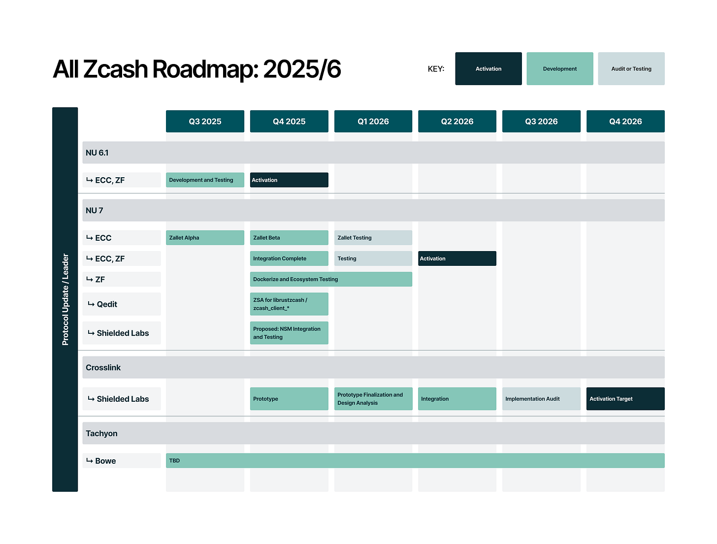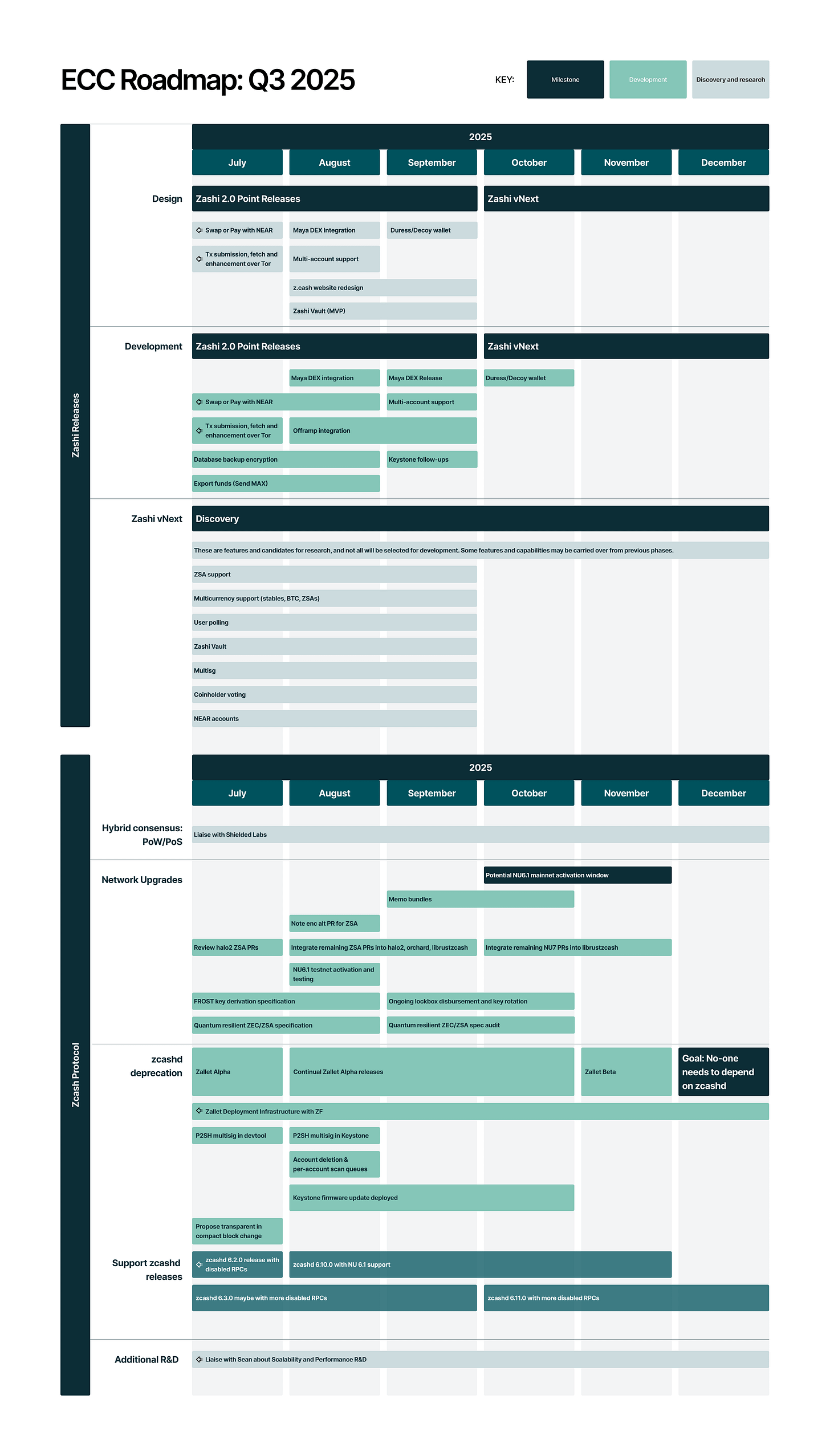 This information is extremely crucial for understanding what’s coming to the ecosystem from the team including developments in Zashi, network upgrades, Zcashd deprecation, PoW/PoS, and more from July through December 2025.