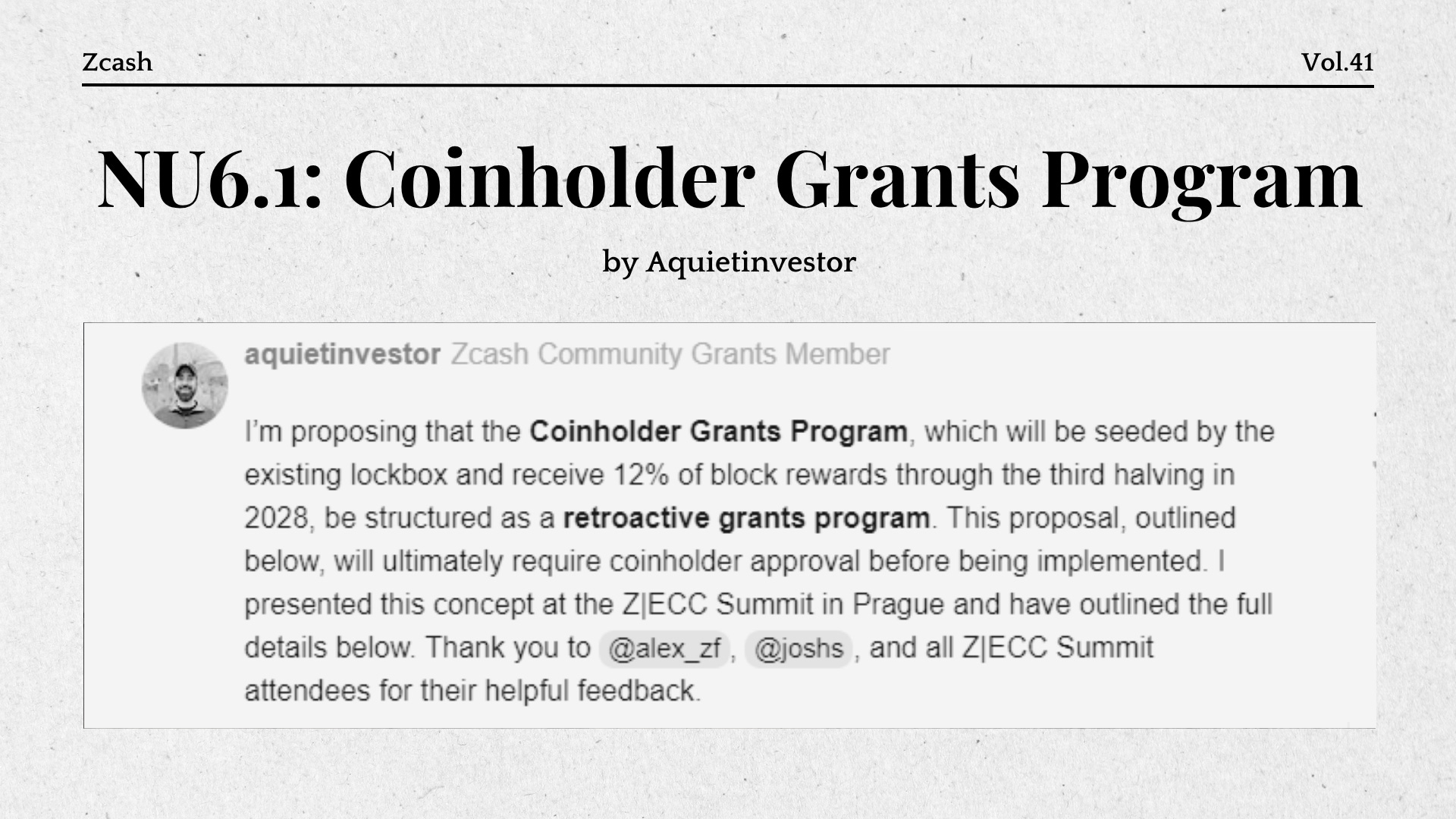 A new proposal from Jason McGee suggests the Coinholder Grants Program use a retroactive funding model, where grants are awarded only for completed work. It aims to simplify the process, reduce overhead, and give ZEC holders direct control over funding. Grants will be paid in ZEC from a multisig wallet managed by ECC, ZF, and Shielded Labs.